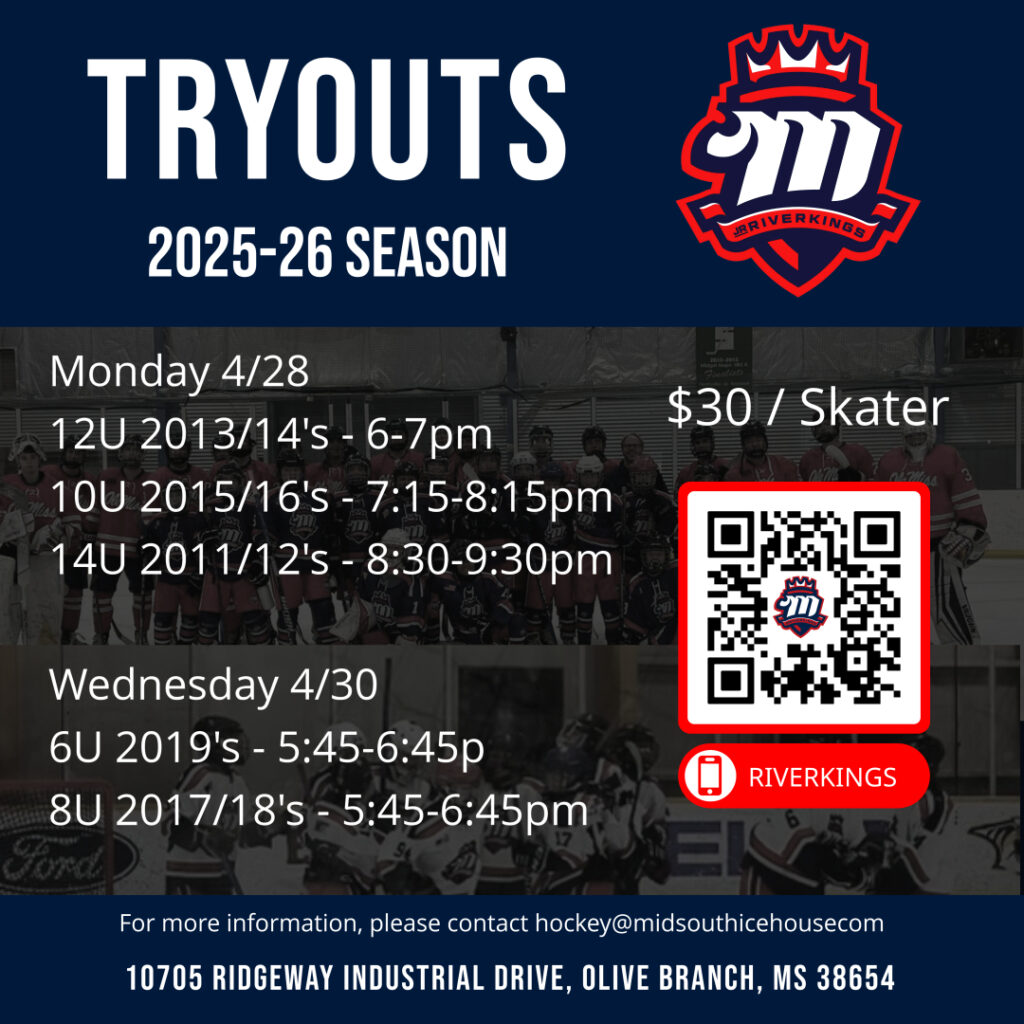 The Memphis Jr. Riverkings are a travel hockey team based out of the Mid South Ice House. Teams participate in the Southern Youth Travel Hockey League and participate in tournaments around the Southeast. The Jr. Riverkings will routinely face teams based out of Huntsville, Birmingham, Nashville, Atlanta and St. Louis. Teams will practice twice a week, play in twenty league games and play three or more tournaments. For our 8U groups, teams will have practices but only participate in tournaments. League weekends will consist of two games on a Saturday afternoon and two games on a Sunday morning. This will allow families to travel on Saturday morning and Sunday afternoon and stay at away games for one night. Teams will be selected after tryouts in late April. Practices will begin in August and go till the end of February. Please contact hockey director at hockey@midsouthicehouse.com for any inquiries.